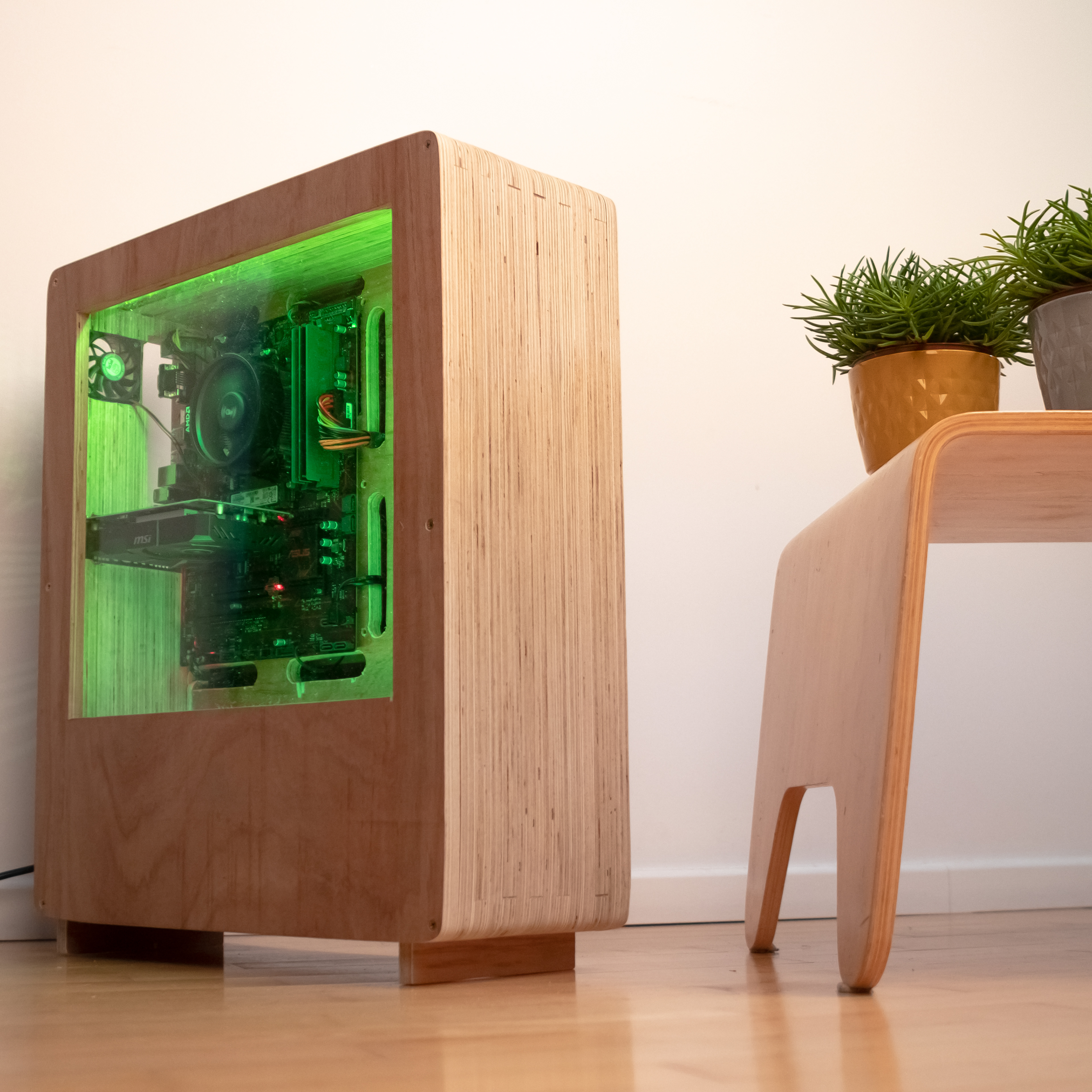 During COVID, I designed and built this 95% wooden PC case matching the office's interior. Equipped with cable management, LED lights and an active cooling solution.